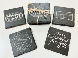 Set of four real slate stone coasters, engraved with four different designs celebrating Owen's Outfitters and the heroes that support our mission.